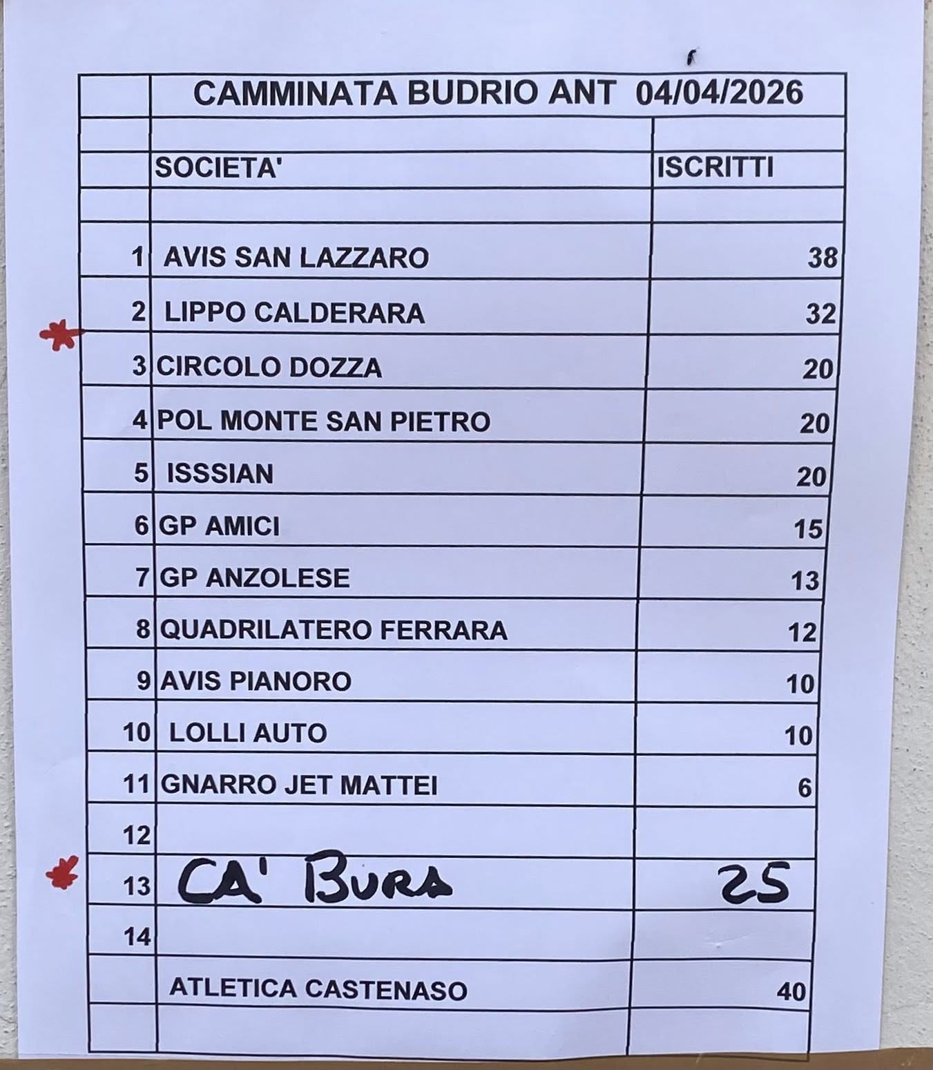 Iscrizioni : Società sportive dal 6 al 10 aprile (ore 20‑22) al numero 3391587241; per i singoli è possibile iscriversi fino a 15 minuti prima della partenza.